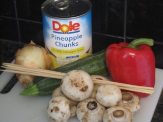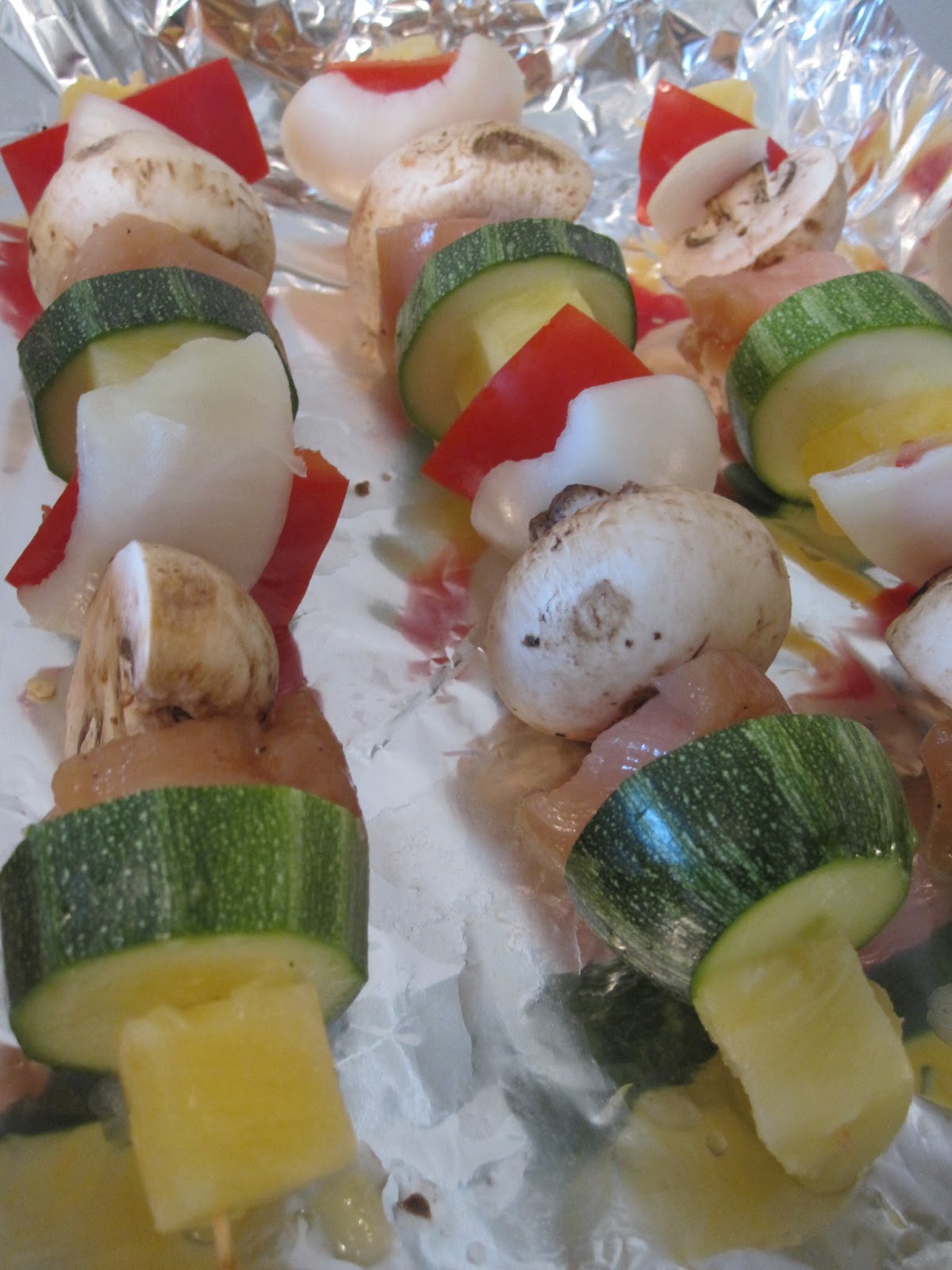 Slide pineapple, mushrooms, chicken and dice veggies onto skewers. Place in pan and drizzle left over marinade over the top.