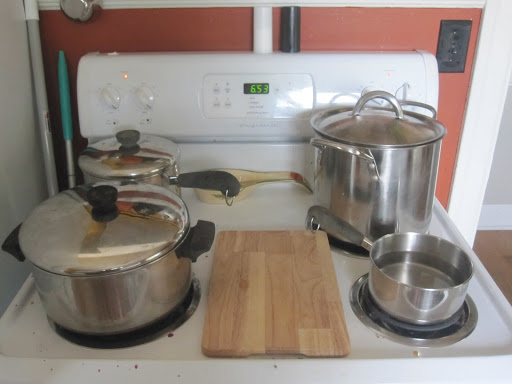 | Back left burner – jar sterilization. Back right burner – water bath. Front right burner – sterilize lids. Front Left burner – make jam. Middle – fill and cap jars. |