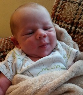 Well, Charlie is 1 month old (started out as 8 lbs 3 oz). As you can see, the smalls don’t quite fit anymore and let me tell ya… they don’t contain the mess even though we can technically get them on.