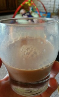 Mommy step – forget to take a picture of the full glass of milk that you so carefully mixed in one of your husband’s pretty whiskey tumblers. Sit down to watch “So you think you can dance”, drink the milk, and blog while the toddler naps and the baby plays happily. A rare moment of peace! Realize mistake and snap quick picture of half finished glass with cell phone.