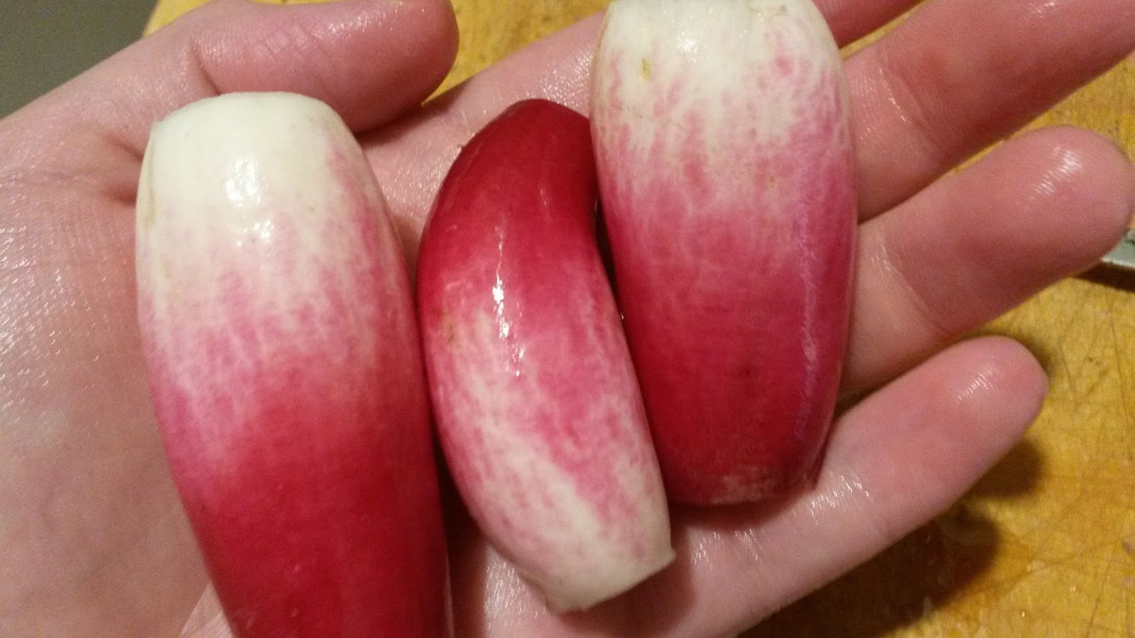 It’s not all processed stuff.  There are plenty of organic fruits and veggies in my garden and fridge.  There is good cheese and organic yogurt.  There is sprouted organic and whole wheat bread.  There are almonds, which are a favorite of Gilbert’s.  Check out these radishes from our garden… I may never grow another variety: